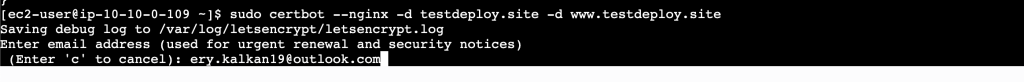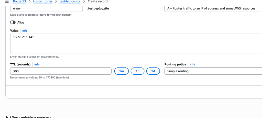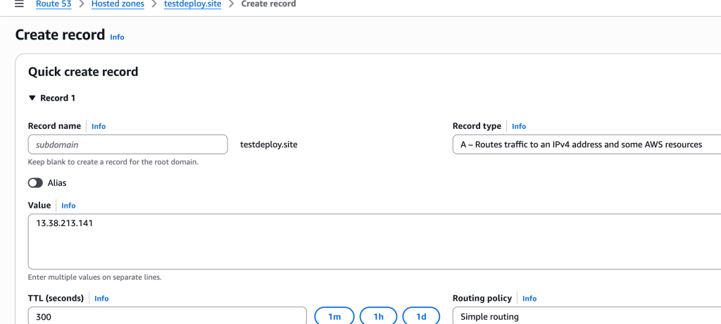 Route 53 üzerinde testdeploy.site domainine A kaydı ekleyerek elastic IP adresimizle ilişkilendirdim.